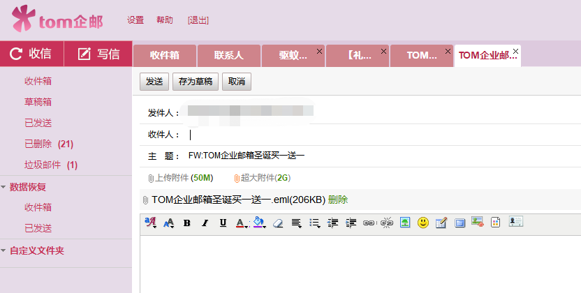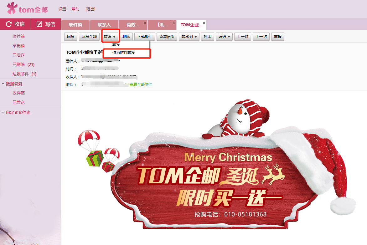 2. 点击转发→作为附件转发,即可将该邮件放到附件中