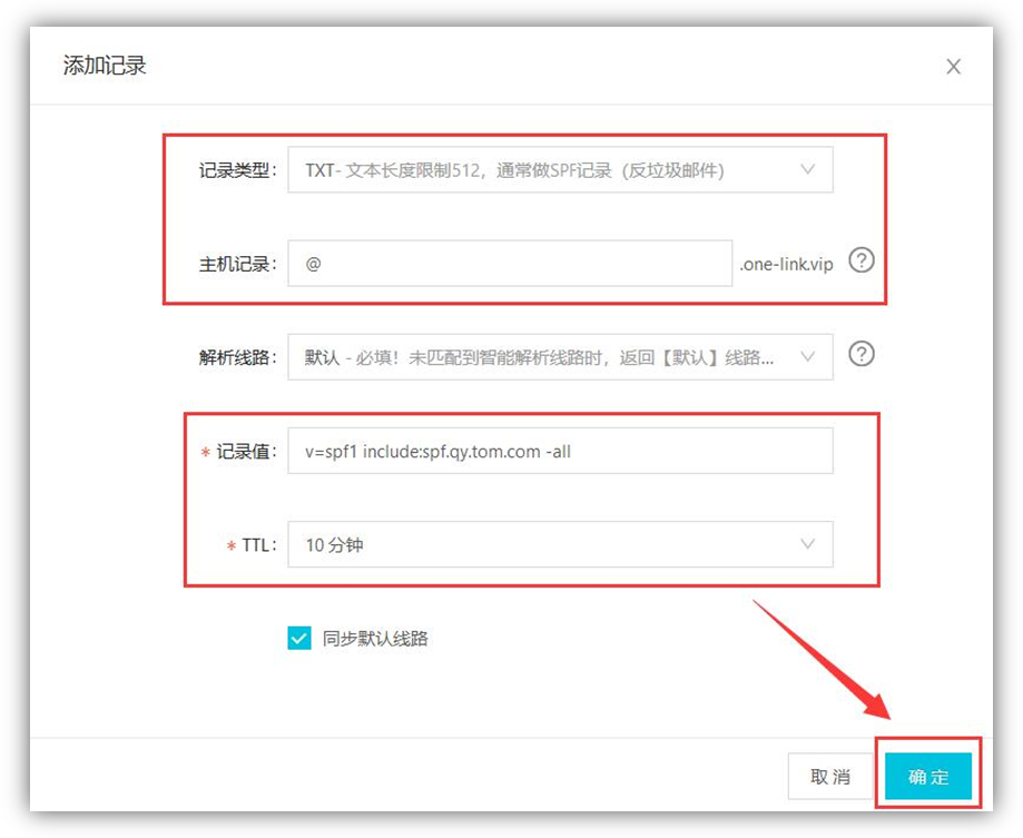 3. 在域名页面点击【添加记录】,按下图指示填写TXT记录,点击【确定】
